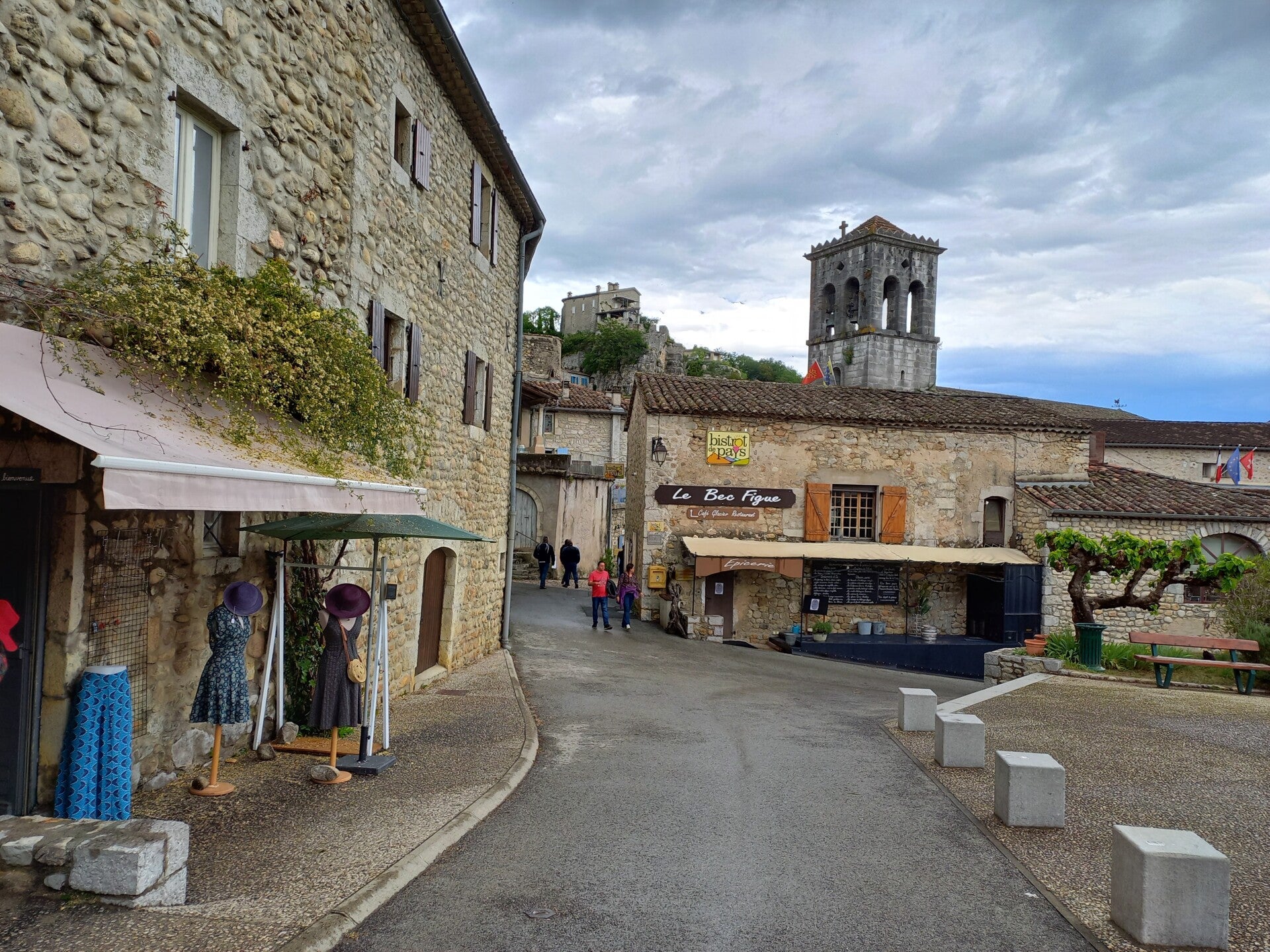 Tout petit village, dont nous découvrons le cachet sous un parapluie. Après une halte à l'épicerie touristique, nous grimpons jusqu'au belvédère.